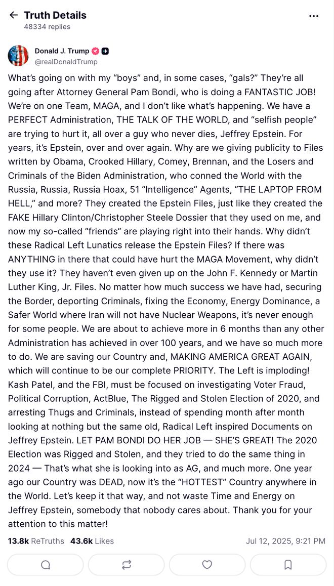 当司法部与联邦调查局在7月7日发布备忘录,明确否认存在“爱泼斯坦客户名单”并认定其死因为自杀后,迅速调整策略,并未深挖爱泼斯坦案的刑事细节,而是将整个事件转化为对特朗普政府政治诚信的质疑攻势。人意识到,这份否认性文件对于长期以“揭露深层政府阴谋”为自我动员基础的特朗普运动,是一次具有杀伤力的叙事崩塌,因此,关键不是“名单是否存在”,而是“为何你承诺有名单、却最终什么也没有”。