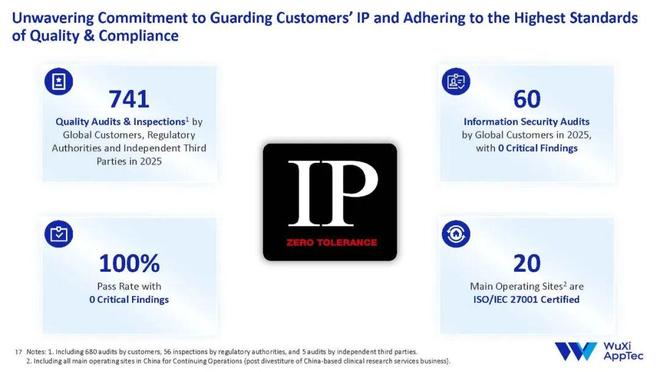 质量正是信赖的基石。药明康德始终恪守全球质量标准,并将知识产权视为与客户共同的生命线次来自全球客户和监管机构的质量审查,以及60次全球客户的信息安全审查——相当于平均每天进行2次以上的质量审查,每周进行1次以上的信息安全审查——通过率保持100%,且没有重大发现项。这再次印证,药明康德的高标准质量体系,经得起随时随地的检验。