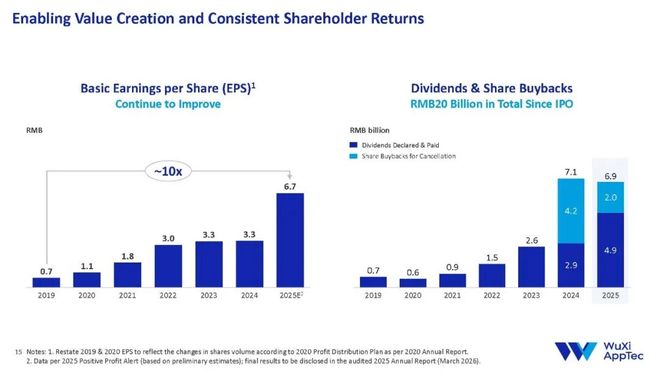 优质的业绩回报还将与更多人共享。一方面,药明康德坚持大力回馈股东,为投资者创造长期价值。2020年至今,公司收入和经调整non-IFRS归母净利润的复合年增长率分别超过20%和30%。公司预计2025年基本每股收益6.7元,自IPO以来几乎翻了十倍。
