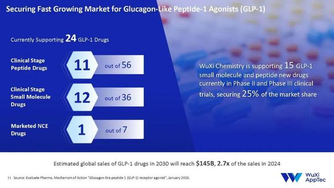 以备受瞩目的GLP-1领域为例,行业报告预测GLP-1类药物销售额在2030年将达到1,450亿美元,接近2024年的三倍。药明康德深度参与GLP-1领域,且相关管线增速超过行业平均增速。据陈民章博士透露,目前药明康德平台上的GLP-1管线个处于II期和III期临床阶段。